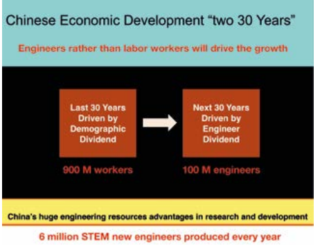 圖2中國(guó)經(jīng)濟(jì)發(fā)展的兩個(gè)30年周期。第一個(gè)時(shí)期(1981 - 2011年)是由9億低成本勞動(dòng)力的人口紅利驅(qū)動(dòng)的。下一個(gè)時(shí)期(2011 - 2041)是由1億技術(shù)人員和工程師的工程師紅利驅(qū)動(dòng)的,中國(guó)繼續(xù)每年產(chǎn)生600萬工程師。