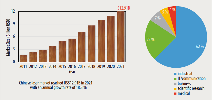 中國(guó)激光市場(chǎng)是世界上最大的工業(yè)激光市場(chǎng)?;仡?020年,中國(guó)激光產(chǎn)業(yè)全年實(shí)現(xiàn)了10個(gè)百分點(diǎn)的正增長(zhǎng),遠(yuǎn)遠(yuǎn)超出預(yù)期,2021中國(guó)激光產(chǎn)業(yè)繼續(xù)保持增長(zhǎng)趨勢(shì)。2021,該國(guó)激光設(shè)備市場(chǎng)的總體規(guī)模同比增長(zhǎng)18.3%,達(dá)到創(chuàng)紀(jì)錄的129億美元(圖3)。在中國(guó)從舊的低技術(shù)產(chǎn)業(yè)向新的高技術(shù)產(chǎn)業(yè)轉(zhuǎn)型的過程中,激光技術(shù)的應(yīng)用已成為許多制造業(yè)提高產(chǎn)品質(zhì)量、降低成本、最終提高競(jìng)爭(zhēng)力的關(guān)鍵。