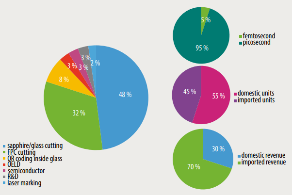 在半導(dǎo)體、顯示器制造和玻璃加工需求的推動(dòng)下,中國(guó)的超快激光市場(chǎng)正在快速增長(zhǎng)。2021,超過45家制造商在中國(guó)共售出2400臺(tái)激光器。銷售的超快激光器中95%是皮秒激光器。飛秒激光只占據(jù)了很小的市場(chǎng)份額。國(guó)產(chǎn)激光器占總銷量的55%,但僅占總收入的30%,這表明國(guó)產(chǎn)超快激光器的功率水平較低,大多在10至50瓦之間,而進(jìn)口激光器則用于更高功率的應(yīng)用。