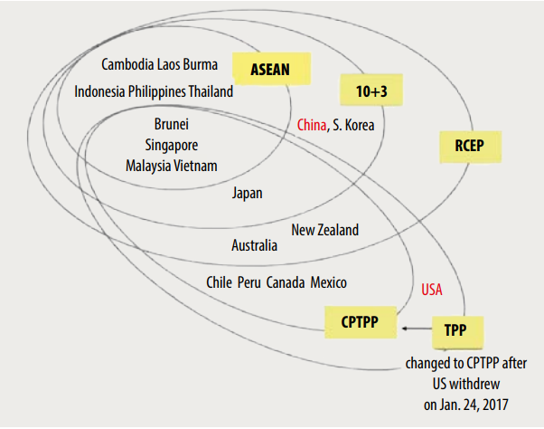 圖6亞洲區(qū)域經(jīng)濟(jì)一體化——RCEP(區(qū)域全面經(jīng)濟(jì)伙伴關(guān)系,11個(gè)國(guó)家)和CPTPP(跨太平洋伙伴關(guān)系全面漸進(jìn)協(xié)議,15個(gè)國(guó)家)。