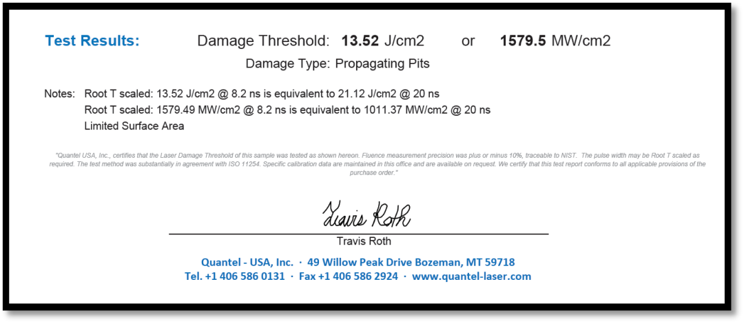 圖7 HR-355nm激光損傷測試結(jié)果(Tested By USA Quantel-Laser)