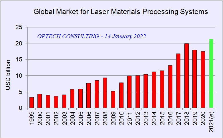 市場研究公司Optech Consulting的一項(xiàng)最新調(diào)研報(bào)告顯示,去年全球工業(yè)激光系統(tǒng)市場顯示出強(qiáng)勁的增長勢頭?;?021年前三個(gè)季度的初步數(shù)據(jù)顯示,全球工業(yè)激光系統(tǒng)市場規(guī)模達(dá)到213億美元,創(chuàng)下歷史新高,較2020年增長了22%。工業(yè)激光源市場在過去一年也創(chuàng)下了52億美元的新紀(jì)錄,光纖激光器占比超過50%,而美國IPG 作為光纖激光器的龍頭企業(yè),占據(jù)光纖激光器近五成份額。