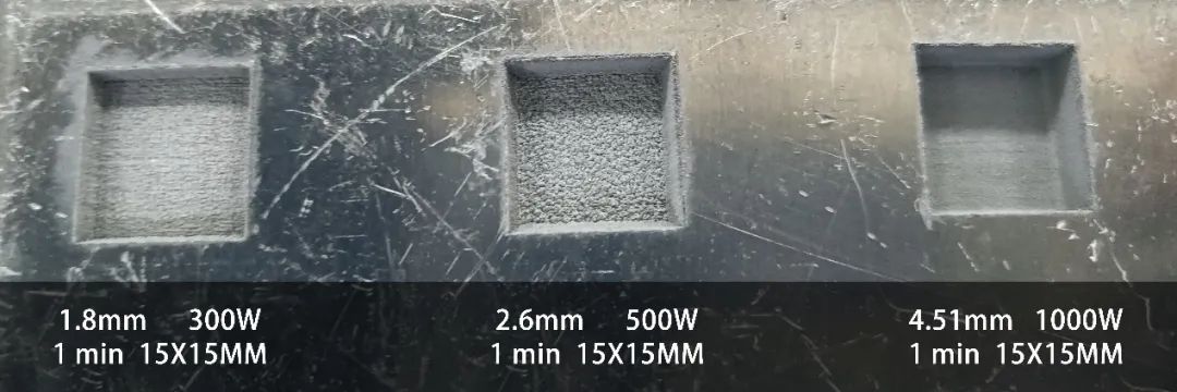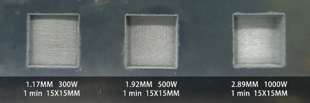 為了粗略測試1000W MOPA激光器,基本性能,我們進(jìn)行了對比實(shí)驗(yàn)。實(shí)驗(yàn)配置F160焦距的場鏡,在鋁材上進(jìn)行一分鐘的15mm*15mm面積深雕,分別使用公大激光的300W 、500W 和 1000W MOPA 進(jìn)行對比測試。分別測試了,采用正焦深雕和Z軸同步移動兩種方式,測試結(jié)果見下: