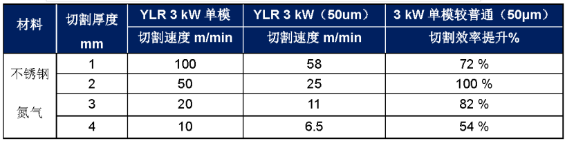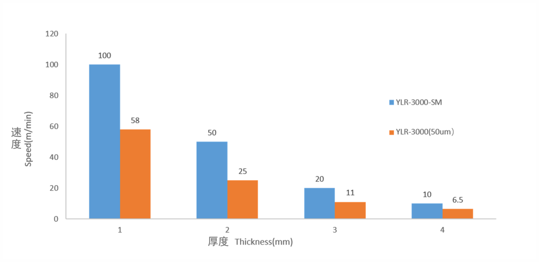 圖表3. YLR 3kW單模激光器和YLR 3kW(50μm)不銹鋼氮氣切割速度對比