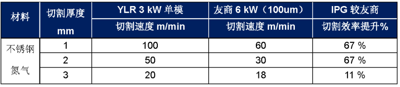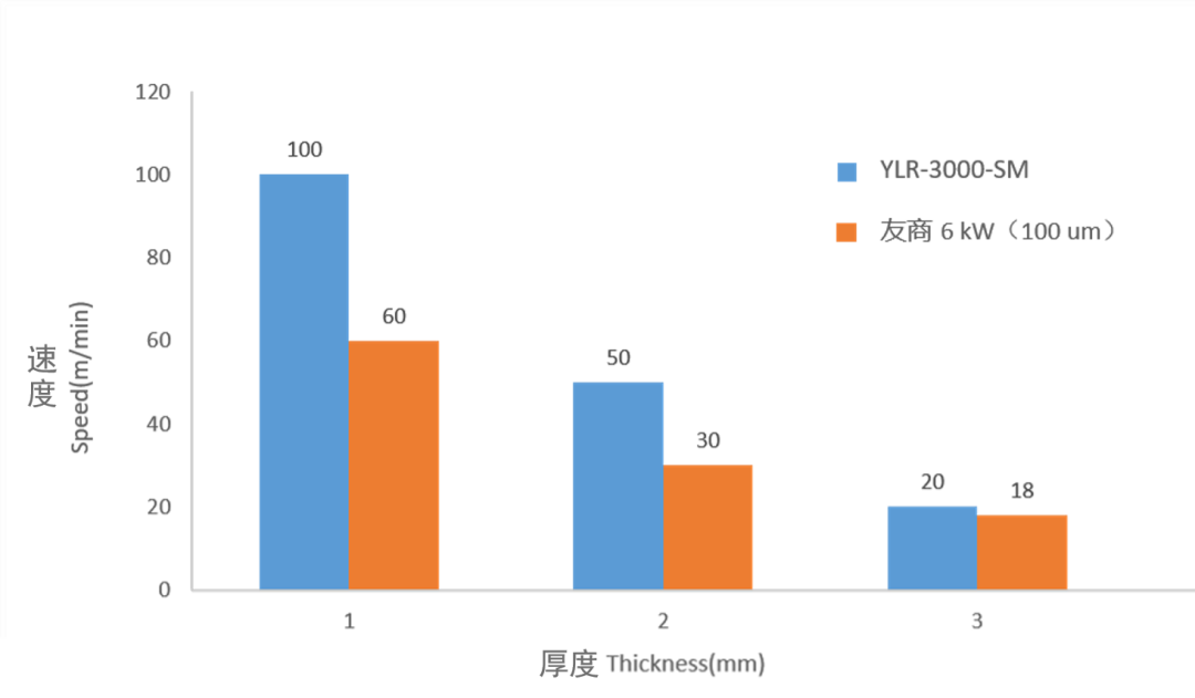 圖表2. YLR 3kW單模激光器和友商6kW(100μm)激光器不銹鋼氮氣切割速度對比