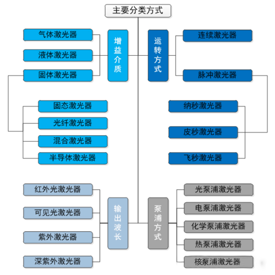 激光器種類繁多,分類標(biāo)準(zhǔn)各異,但以增益介質(zhì)、運(yùn)轉(zhuǎn)方式、泵浦方式和輸出波長為標(biāo)準(zhǔn)的分類方式 最為常見。