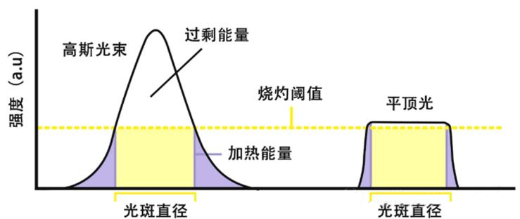 與高斯激光束相比,平頂激光束能更有效地利用能量。在高斯光束輪廓中,中間高于應(yīng)用要求的強(qiáng)度閾值的過(guò)剩能量和兩翼中低于閾值要求的能量,都被浪費(fèi)掉了。平頂光束輪廓中沒(méi)有兩翼,但具有較陡的邊緣過(guò)渡,因此能量利用效率更高,并且對(duì)周圍區(qū)域的損傷也會(huì)減少。