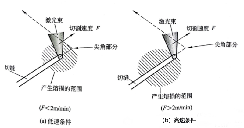尖角部位發(fā)生過燒通常是由于熱量堆積引起的,具體是因?yàn)楫?dāng)激光經(jīng)過時(shí),該尖角處溫度已經(jīng)上升到很高。倘若激光束的前進(jìn)速度大于熱量的傳遞速度,則可以有效地避免過燒。