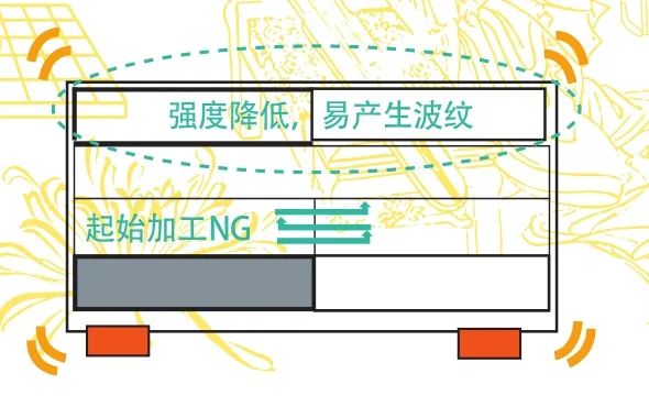 采用復(fù)合機(jī)進(jìn)行鈑金激光切割下料時(shí),機(jī)床夾鉗夾持板材沿X方向和Y方向移動(dòng),制品加工設(shè)備及加工區(qū)域如圖1所示。但隨著加工的不斷進(jìn)行,板材局部應(yīng)力被釋放,強(qiáng)度逐漸減弱,導(dǎo)致板材在運(yùn)動(dòng)過(guò)程中產(chǎn)生晃動(dòng),從而產(chǎn)生激光切割波紋,造成加工制品不良。而切割波紋的大小還與制品的加工方向、初始加工位置、制品取出順序等因素有關(guān),不同情況的切割波紋不良現(xiàn)象如圖2、圖3所示。且大尺寸制品由于從板材上切割開(kāi)后,板材的應(yīng)力釋放會(huì)較大,因此在切割板材剩余部分時(shí),板材隨夾鉗移動(dòng),晃動(dòng)就會(huì)更大,造成切割剩余制品時(shí)產(chǎn)生切割波紋。由于產(chǎn)品尺寸較大、加工時(shí)間較長(zhǎng),因此造成加工費(fèi)用及材料浪費(fèi)較多,所以盡可能保證板材在切割運(yùn)動(dòng)過(guò)程中的受力穩(wěn)定及受力強(qiáng)度是切割下料過(guò)程中需要重點(diǎn)考慮的問(wèn)題。