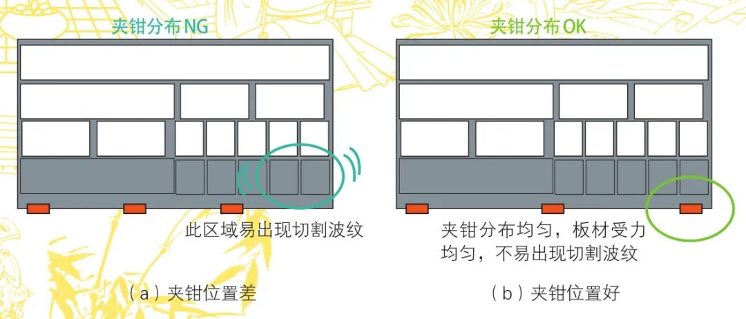 夾鉗的作用,其一就是夾持板材隨著加工程序進(jìn)行X、Y方向的運(yùn)動(dòng),其二就是保證板材在加工運(yùn)行過(guò)程中的穩(wěn)定性。因此,要合理分布夾鉗夾持板材的位置,做到夾鉗分布均勻,避免夾鉗偏向一側(cè)導(dǎo)致板材不穩(wěn)定產(chǎn)生晃動(dòng),導(dǎo)致切割波紋的產(chǎn)生。夾鉗夾持位置對(duì)比如圖8所示,此因素對(duì)切割波紋雖有一定影響,但屬于操作過(guò)程中可避免的影響因素。