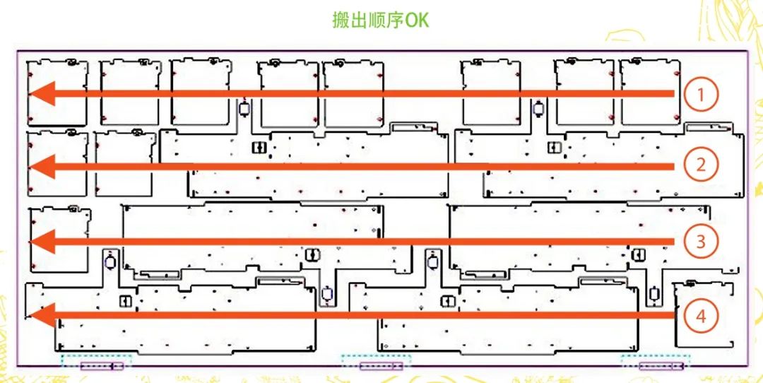 生產(chǎn)過(guò)程中,有時(shí)會(huì)使用TK機(jī)械手輔助取出切割完成的制品,這樣能更好地節(jié)約人力物力,實(shí)現(xiàn)設(shè)備的全自動(dòng)化生產(chǎn)。但是在使用TK機(jī)械手取出制品時(shí)需要注意,要控制好制品的取出順序,避免板材因強(qiáng)度減弱、材料晃動(dòng)產(chǎn)生切割波紋。如果先選擇將板材兩端制品取出,再將板材中間的制品取出,這樣就會(huì)造成板材兩端的應(yīng)力被釋放,板材強(qiáng)度不足,當(dāng)加工程序進(jìn)行到板材中間位置時(shí),板材勢(shì)必會(huì)因強(qiáng)度不足而產(chǎn)生晃動(dòng),造成制品的切割波紋,如圖9所示,且產(chǎn)品不良率較高,加工損失較大。如果從遠(yuǎn)離夾鉗一側(cè)將制品依次取出,這樣可以很好地保證加工位置板材應(yīng)力集中,運(yùn)動(dòng)穩(wěn)定,避免產(chǎn)生切割波紋,如圖10所示。因此在加工編程時(shí),要保證被取出的制品從遠(yuǎn)離夾鉗一端依次進(jìn)行,這樣可以很好地保證板材強(qiáng)度,避免板材在運(yùn)動(dòng)過(guò)程中因強(qiáng)度不足而產(chǎn)生晃動(dòng),從而避免切割波紋的產(chǎn)生。