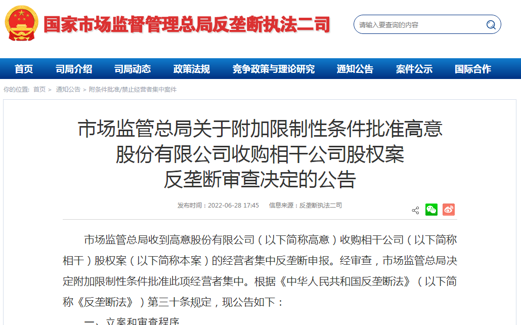 6月28日,國家市場監(jiān)管總局(以下簡稱“市監(jiān)總局”)發(fā)布公告,附加限制性條件批準高意股份有限公司(以下簡稱“美國高意”)收購相干公司。這是2022年以來,市監(jiān)總局批準的第三宗國際并購案。