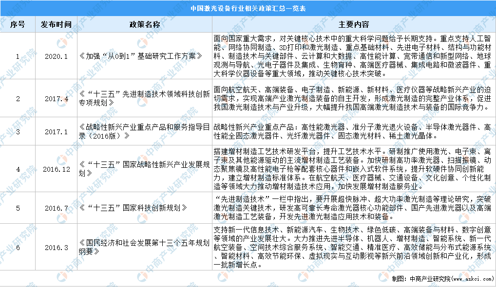 激光加工技術(shù)是我國(guó)重點(diǎn)支持發(fā)展的領(lǐng)域,作為現(xiàn)代制造業(yè)的支持性產(chǎn)業(yè),在國(guó)民經(jīng)濟(jì)發(fā)展過(guò)程中扮演著重要角色。國(guó)家為扶持激光加工技術(shù)的發(fā)展,制定了多項(xiàng)政策及法律法規(guī)。為規(guī)范激光行業(yè)的競(jìng)爭(zhēng)秩序,加強(qiáng)對(duì)激光行業(yè)相關(guān)知識(shí)產(chǎn)權(quán)的保護(hù)力度,促進(jìn)激光技術(shù)的發(fā)展創(chuàng)造了有利的環(huán)境。國(guó)家政策的落地實(shí)施為激光技術(shù)及激光制造的發(fā)展提供了保障,有力促進(jìn)激光設(shè)備行業(yè)的可持續(xù)發(fā)展。
