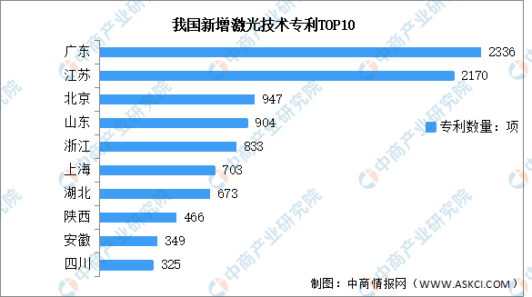 從研發(fā)創(chuàng)新和技術(shù)應(yīng)用上來(lái)看,廣東、江蘇是激光技術(shù)創(chuàng)新大省,專利申請(qǐng)量均高于2000項(xiàng),多年一直保持領(lǐng)先地位;北京、山東位列第二梯隊(duì),專利申請(qǐng)量高于900項(xiàng);浙江、上海、湖北等省市則處于第三梯隊(duì)。隨著激光技術(shù)在科學(xué)研究領(lǐng)域的不斷深入和在實(shí)踐中的持續(xù)積累,預(yù)計(jì)未來(lái)的專利申請(qǐng)量還將不斷增多,激光技術(shù)也將在我國(guó)的社會(huì)生產(chǎn)活動(dòng)中發(fā)揮出更大的作用。