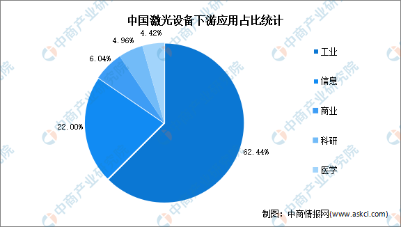 從下游應(yīng)用來(lái)看,我國(guó)作為全球最大的制造業(yè)國(guó)家,激光設(shè)備目前主要應(yīng)用于工業(yè)生產(chǎn)之中。2020年,工業(yè)領(lǐng)域激光設(shè)備市場(chǎng)規(guī)模為432.1億元,占總市場(chǎng)規(guī)模的比重為62.44%;信息領(lǐng)域激光設(shè)備市場(chǎng)規(guī)模為152.2億元,占比為22%;商業(yè)、科研和醫(yī)用激光設(shè)備占比則均未超過(guò)10%,分別以41.8億元、34.3億元和30.6億元位列三、四、五位。預(yù)計(jì)2022年我國(guó)激光設(shè)備市場(chǎng)規(guī)模還將繼續(xù)增長(zhǎng),其中工業(yè)用激光設(shè)備依舊是最為主要的增長(zhǎng)點(diǎn)。