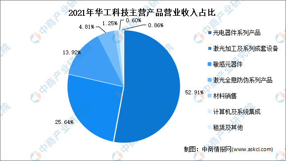 分產(chǎn)品來(lái)看,2021年華工科技主營(yíng)業(yè)務(wù)有光電器件系列產(chǎn)品、激光加工及系列成套設(shè)備、敏感元器件、激光全息防偽系列產(chǎn)品、材料銷售、計(jì)算機(jī)及系統(tǒng)集成、租賃及其他,其營(yíng)業(yè)收入分別占主營(yíng)業(yè)務(wù)收入的52.91%、25.64%、13.92%、4.81%、1.25%、0.60%、0.86%。