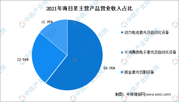 分產(chǎn)品來(lái)看,2021年海目星主營(yíng)動(dòng)力電池激光及自動(dòng)化設(shè)備、3C消費(fèi)類電子激光及自動(dòng)化設(shè)備、鈑金激光切割設(shè)備,其營(yíng)業(yè)收入分別占主營(yíng)業(yè)務(wù)收入的56.05%、23.54%、12.95%。