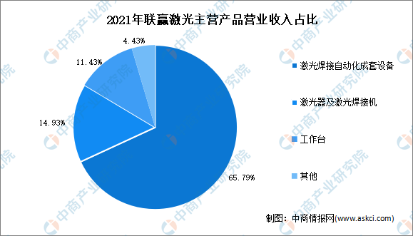 分產(chǎn)品來(lái)看,2021年聯(lián)贏激光主營(yíng)激光焊接自動(dòng)化成套設(shè)備、激光器及激光焊接機(jī)、工作臺(tái),其營(yíng)業(yè)收入分別占主營(yíng)業(yè)務(wù)收入的65.79%、14.93%、11.43%。