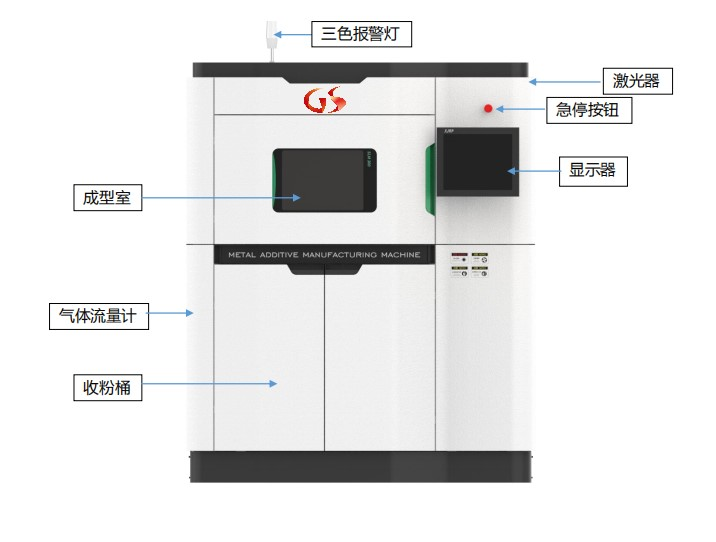 國盛激光SLM300激光3D打印設(shè)備由光學(xué)系統(tǒng)、循環(huán)過濾系統(tǒng)、氣氛保護(hù)系統(tǒng)、控制系統(tǒng)和機(jī)械系統(tǒng)組成,各個(gè)系統(tǒng)之間協(xié)同工作,智能高效的完成整套增材制造過程。該設(shè)備采用氬氣保護(hù)氣氛,有效的保證成型過程零件不被氧化,從而達(dá)到優(yōu)異的產(chǎn)品質(zhì)量。設(shè)備結(jié)構(gòu)如下圖所示: