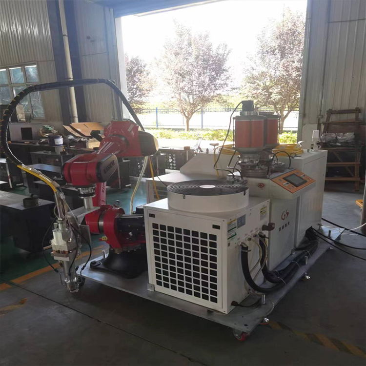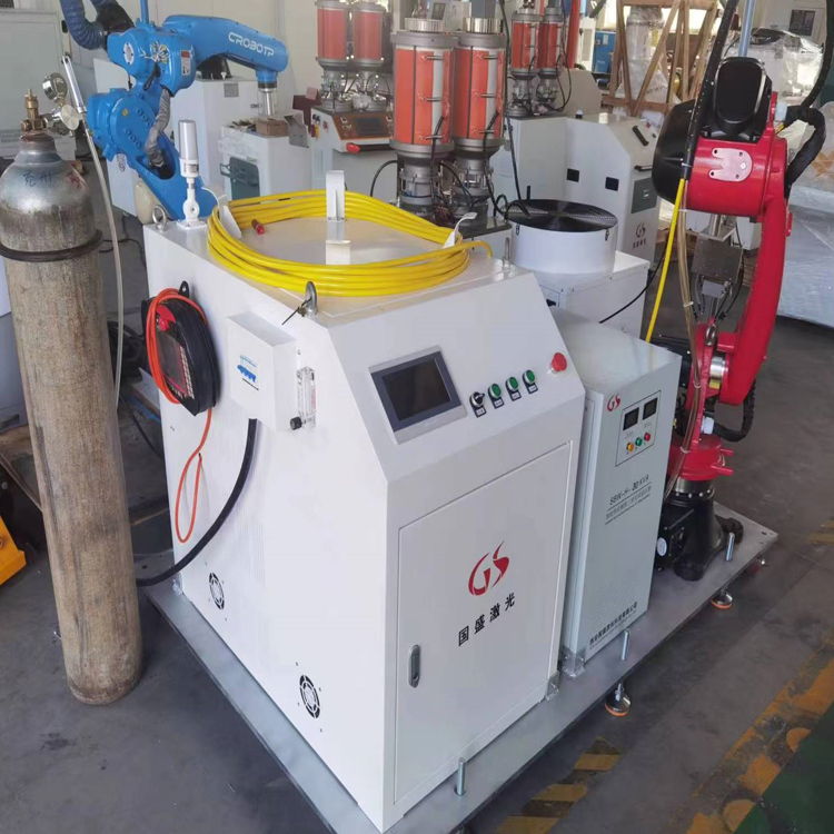移動式激光熔覆設(shè)備主要由前端執(zhí)行器和后端設(shè)備組成。前端執(zhí)行器由多軸工業(yè)機(jī)器人、移動小車及電氣控制系統(tǒng)、送粉機(jī)構(gòu)、激光熔覆頭和熔覆噴嘴組成。后端設(shè)備由高功率光纖激光器、水冷器、電源電箱和保護(hù)氣組成。移動式熔覆設(shè)備幾乎是大型設(shè)備維修現(xiàn)場唯一的維修選擇,尤其是對于那些無法拆卸和運(yùn)輸?shù)牟考?/span>